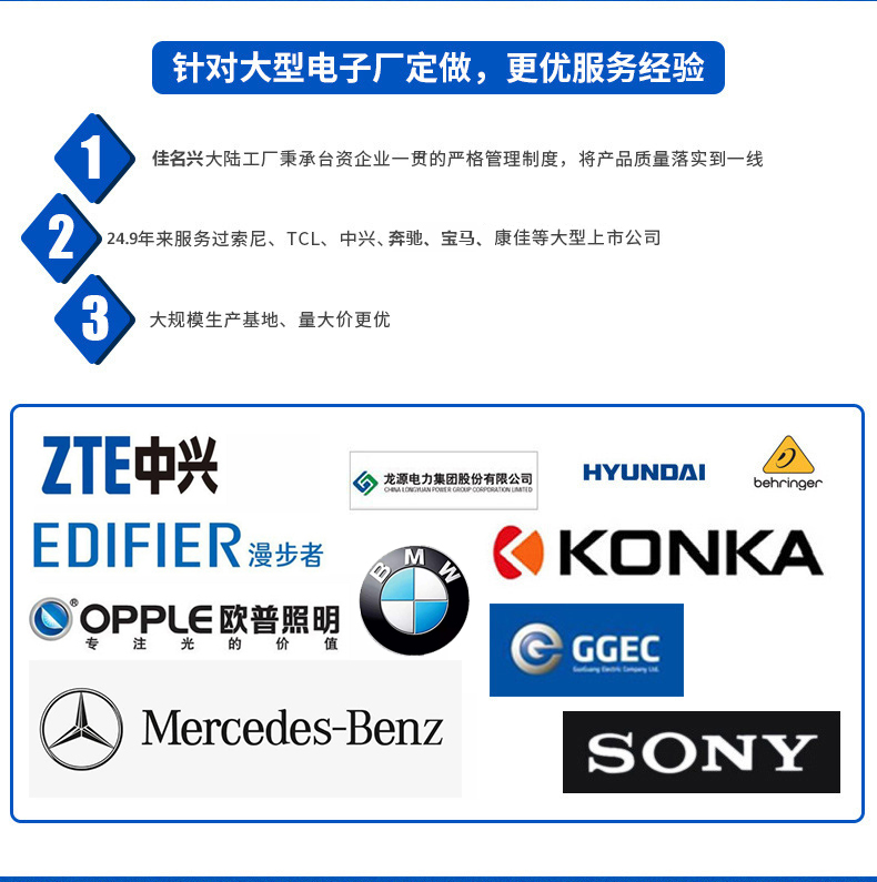 2017年12月28日正式更名為深圳佳名興電容有限公司 佳名興JMX廣東省惠州市電容器工廠占地面積13149平米,廠房面積8227平方米,每年生產(chǎn)的超級(jí)電容(單體、模組、方案定制)薄膜類(lèi)電容(包括:金屬化薄膜電容、軸向薄膜電容,工業(yè)級(jí)電源用薄膜電容、長(zhǎng)壽命薄膜電容、等)軸向鋁電解電容、電力電容器、雙面金屬化薄膜電容等被動(dòng)元器件達(dá)8-13億只 佳名興JMX電容器60%-70%以上產(chǎn)品出口歐美,印度,東南亞等世界各地,30%-40%銷(xiāo)往中國(guó)大陸,產(chǎn)品規(guī)格齊全,體積小,可靠性?xún)?yōu)良,穩(wěn)定性好,價(jià)格合理 佳名興JMX電容器被廣泛用于:汽車(chē)音響,車(chē)載分音器,音響分頻器,專(zhuān)業(yè)音響功放,衛(wèi)星通訊設(shè)備,LED驅(qū)動(dòng)電源,LED節(jié)能燈,開(kāi)關(guān)電源及電腦周邊產(chǎn)品等各個(gè)電子行業(yè)
