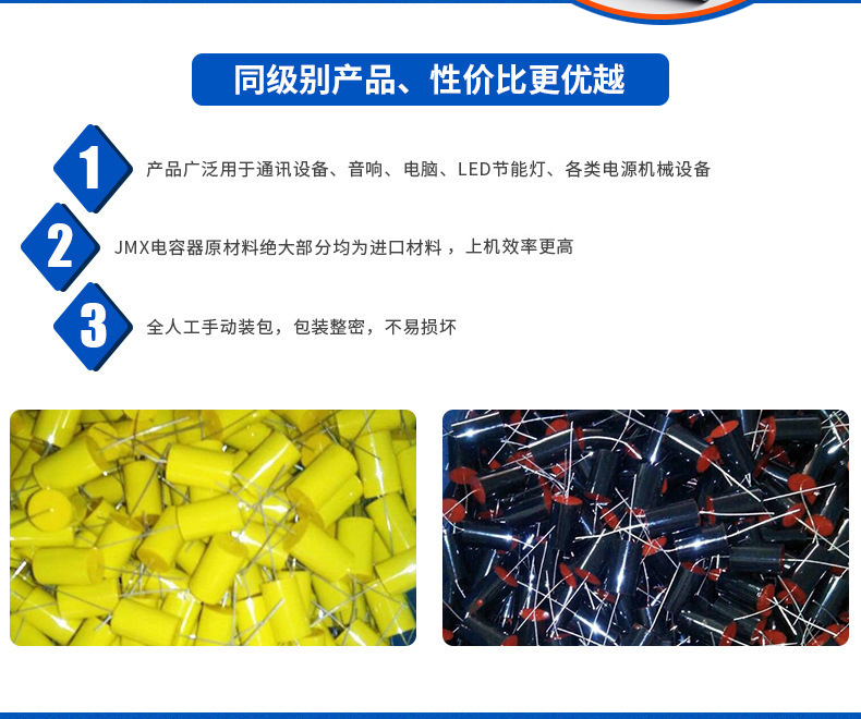 JMX電容為上千家客戶(hù)提供電容近20年,JMX電容已成為優(yōu)質(zhì)的電容供應(yīng)商之一,熱誠(chéng)歡迎各界朋友蒞臨佳名興電容器工廠參觀,指導(dǎo)和業(yè)務(wù)洽談。電容器訂購(gòu)熱線(xiàn):+86 13927412413,了解電容器參數(shù):m.fjlxjj.cn |