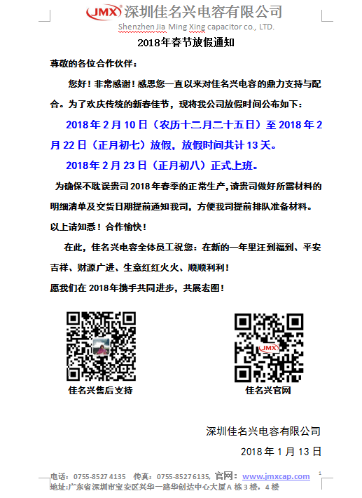 當(dāng)前位置:佳名興首頁 » JMX資訊 » 2018年佳名興電容春節(jié)放假通知