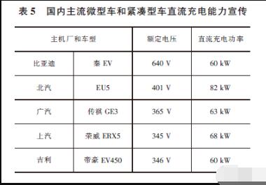 國內(nèi)主流微型車和緊湊車型大部分廠家宣傳30%-80%直流充電時(shí)間30min 左右,充電功率約在60kW-80kW。車型以低電壓為主。如表5 所示。