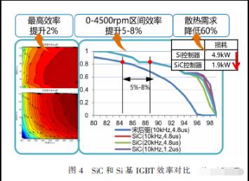 SiC 還具有比IGBT 更低的開關(guān)損耗,彌補(bǔ)了部分其工藝復(fù)雜造成的成本高的缺陷。SiC 和Si 基IGBT 的系統(tǒng)效率對(duì)比如圖4 所示(基于某車型)。
