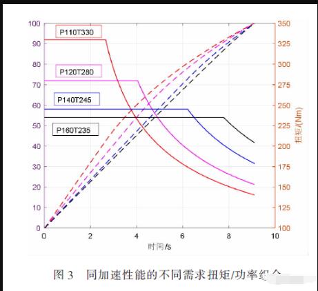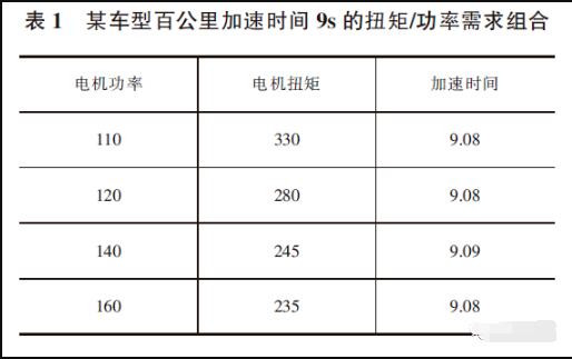 d)同一車型,當(dāng)提升電機(jī)的驅(qū)動(dòng)功率時(shí),可以減小對(duì)扭矩的需求。即不同的扭矩/功率組合,可以實(shí)現(xiàn)相同的0-100km/h 加速時(shí)間要求。