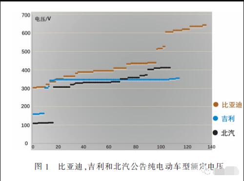 比亞迪,吉利和北汽新能源公告的純電動(dòng)車型額定電壓如圖1 所示。三個(gè)國內(nèi)較大的新能源生產(chǎn)廠家中,只有比亞迪公告了少量的高電壓平臺(tái)車型。