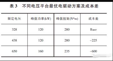 扭矩增加,變速器輸入和輸出軸會(huì)增加成本,傳動(dòng)軸也會(huì)需要加強(qiáng)。電機(jī)不同扭矩/功率的組合,最優(yōu)設(shè)計(jì)方案也會(huì)有成本差異。電壓對(duì)IGBT,電容選型,影響其成本。我們比對(duì)以下不同功率/扭矩組合,及在不同電壓下的最優(yōu)成本,見表2。