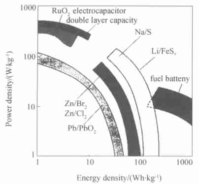 圖1 雙電層超級電容器、電化學(xué)電容器與可充電電池及燃料電池的能量密度、功率密度比較