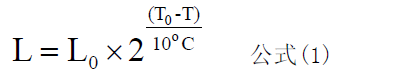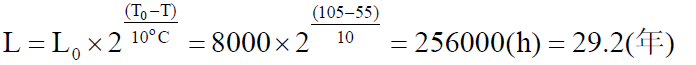 根據(jù)阿列紐斯方程結(jié)論可知,電解電容使用壽命計算公式如下: