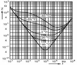 在開(kāi)關(guān)電源輸出端用的濾波電容,與工頻電路中選用的濾波電容并不一樣,在工頻電路中用作濾波的普通電解電容器,其上的脈動(dòng)電壓頻率僅有100Hz,充放電時(shí)間是毫秒數(shù)量級(jí),為獲得較小的脈動(dòng)系數(shù),需要的電容量高達(dá)數(shù)十萬(wàn)微法,因而一般低頻用普通鋁電解電容器制造目標(biāo)是以提高電容量為主,電容器的電容量、損耗角正切值以及漏電流是鑒別其優(yōu)劣的主要參數(shù)。在開(kāi)關(guān)穩(wěn)壓電源中作為輸出濾波用的電解電容器,由于大多數(shù)的開(kāi)關(guān)電源工作在方波或矩形波的狀態(tài),含有及其豐富的高次諧波電壓與電流,其上鋸齒波電壓的頻率高達(dá)數(shù)十千赫,甚至數(shù)十兆赫,它的要求和低頻應(yīng)用時(shí)不同,電容量并不是主要指標(biāo),衡量它好壞的則是它的阻抗頻率特性,如圖3所示。