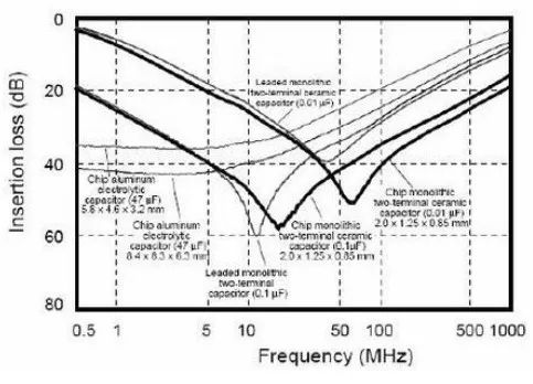 從上面電容的濾波曲線上我們還看出并不是平坦的,它像一個(gè)’V’,也就是說(shuō)有選頻特性,在時(shí)候我們希望它是越平越好(前級(jí)的板級(jí)濾波),而有時(shí)候希望它越越尖越好(濾波或陷波)。影響這個(gè)特性的是電容的品質(zhì)因素Q, Q=1/ωCESR,ESR越大,Q就越小,曲線就越平坦,反之ESR越小,Q就越大,曲線就越尖。